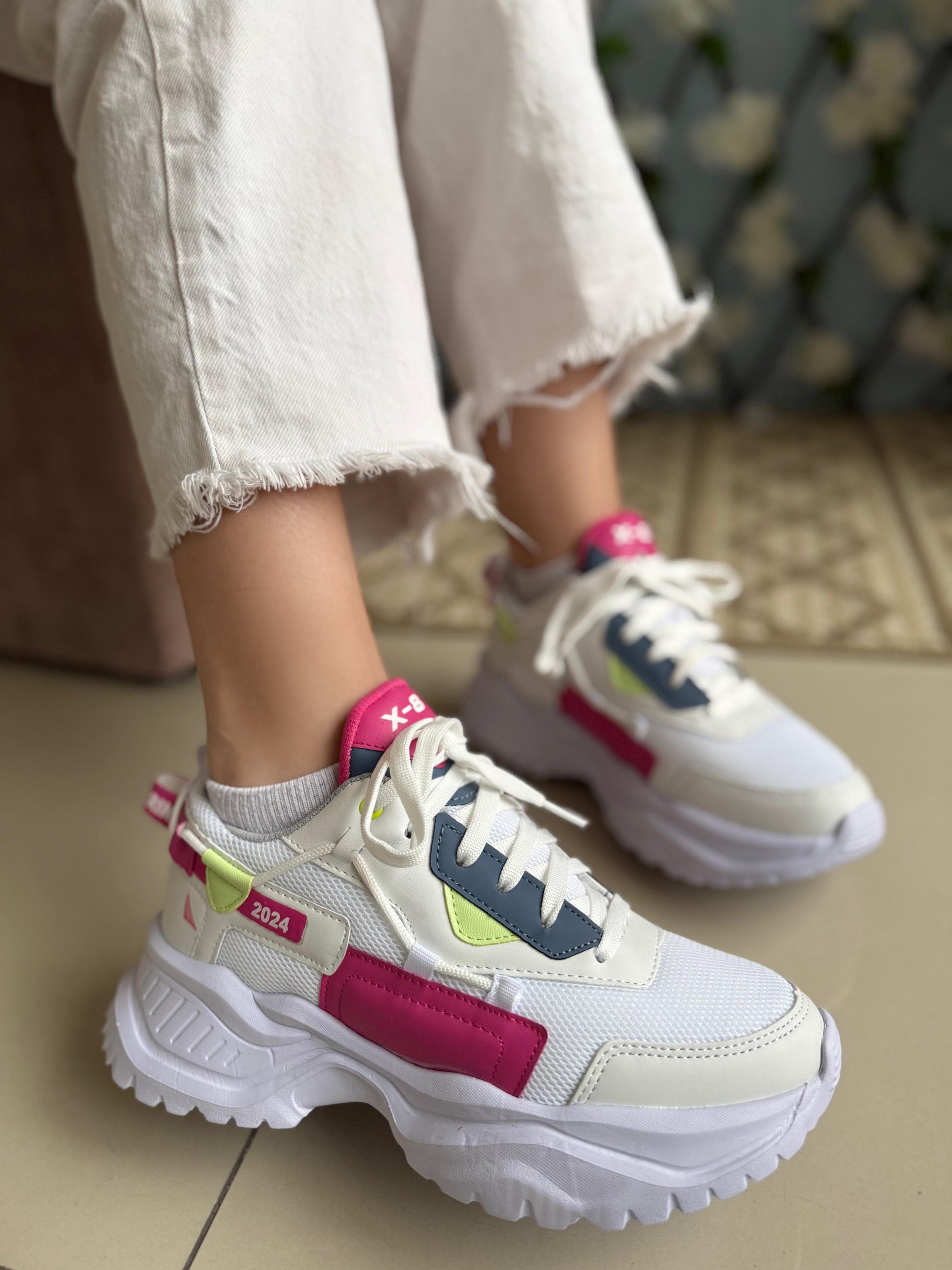 Con una suela gruesa que no solo eleva tu look, sino también tu presencia, estas zapatillas combinan tonos vibrantes como fucsia, lima y azul marino sobre una base blanca que resalta con fuerza. Su diseño robusto pero cómodo está inspirado en las últimas tendencias streetwear y te acompaña desde un día casual hasta una salida con amigas.
