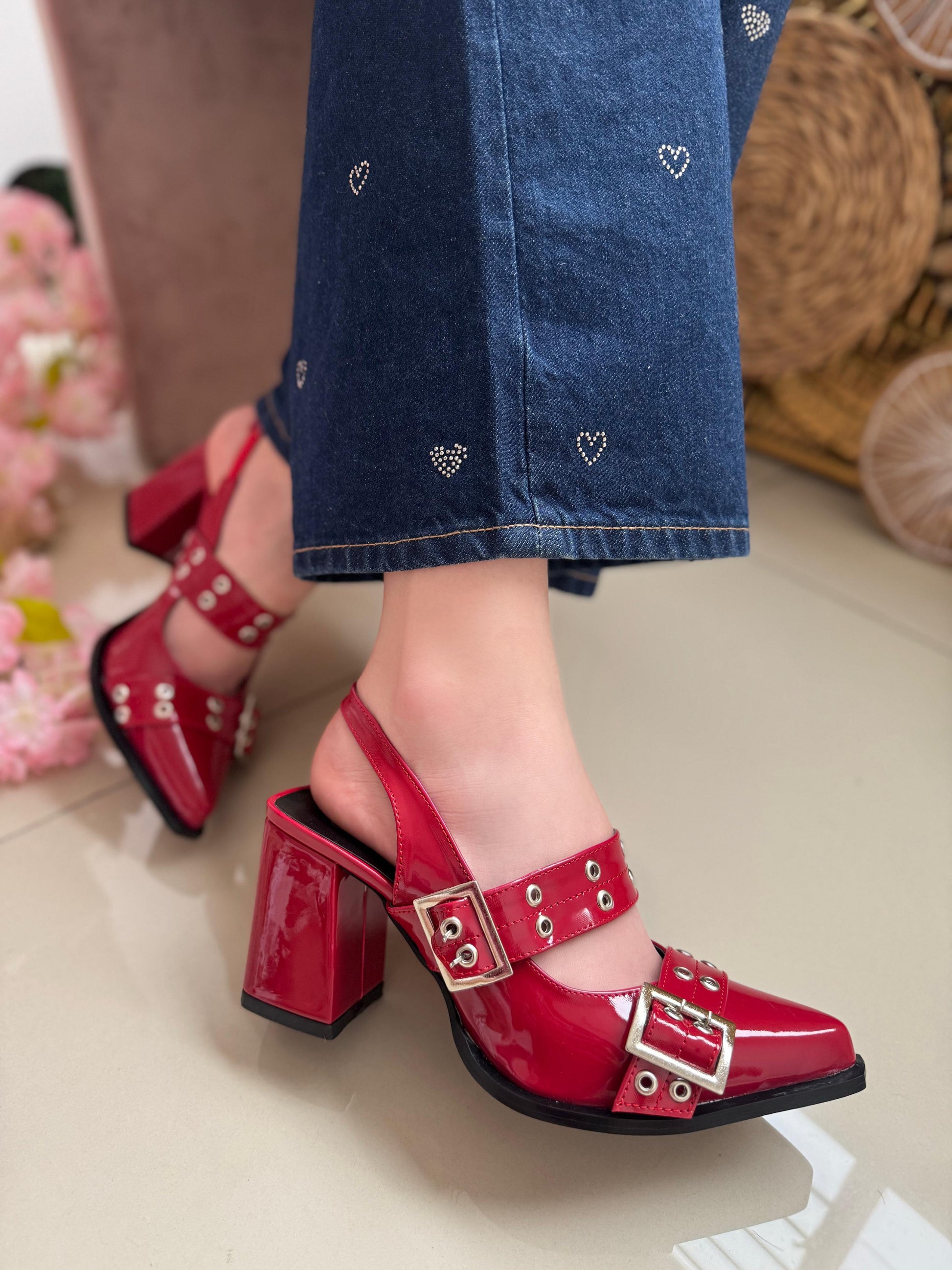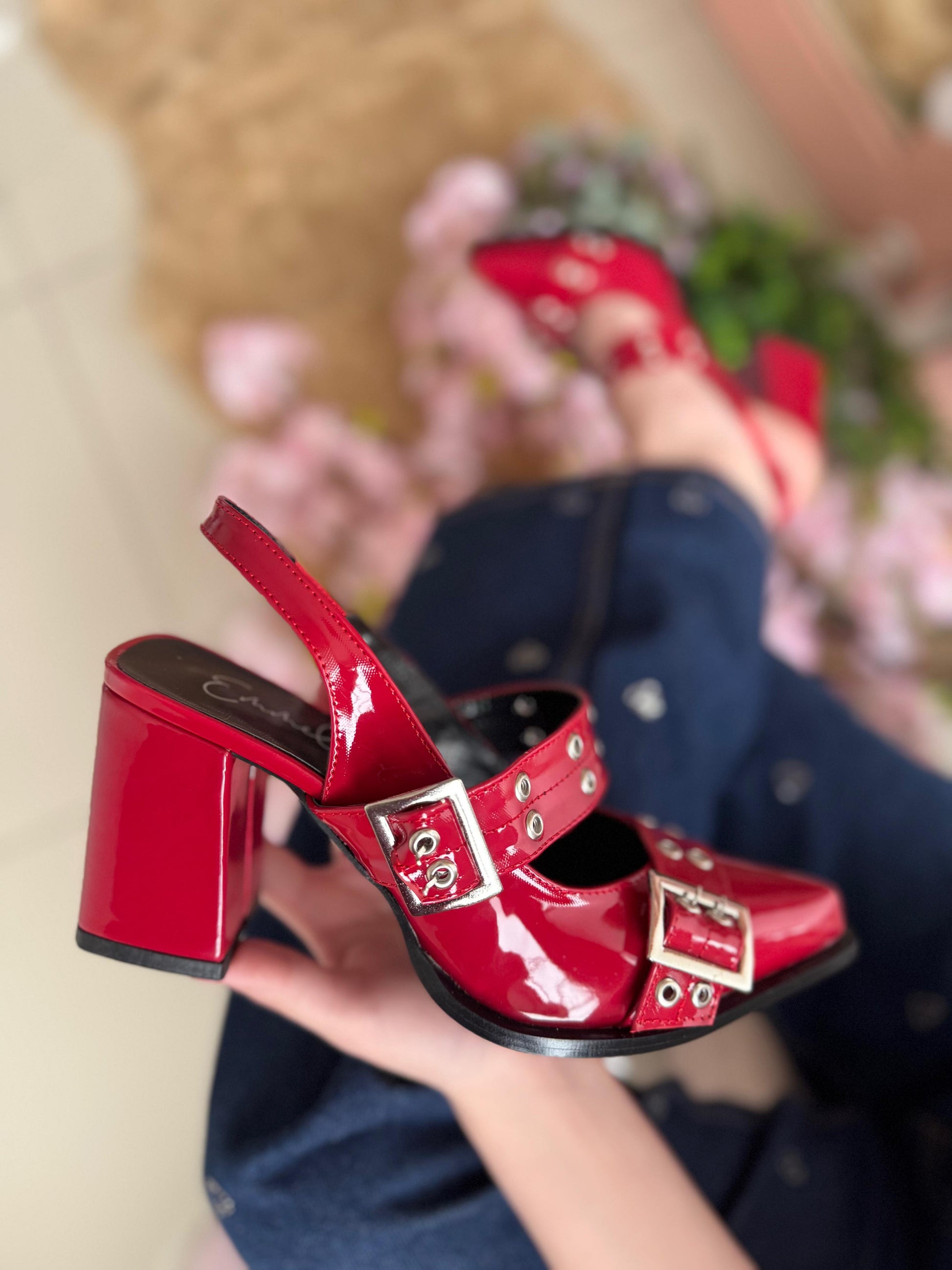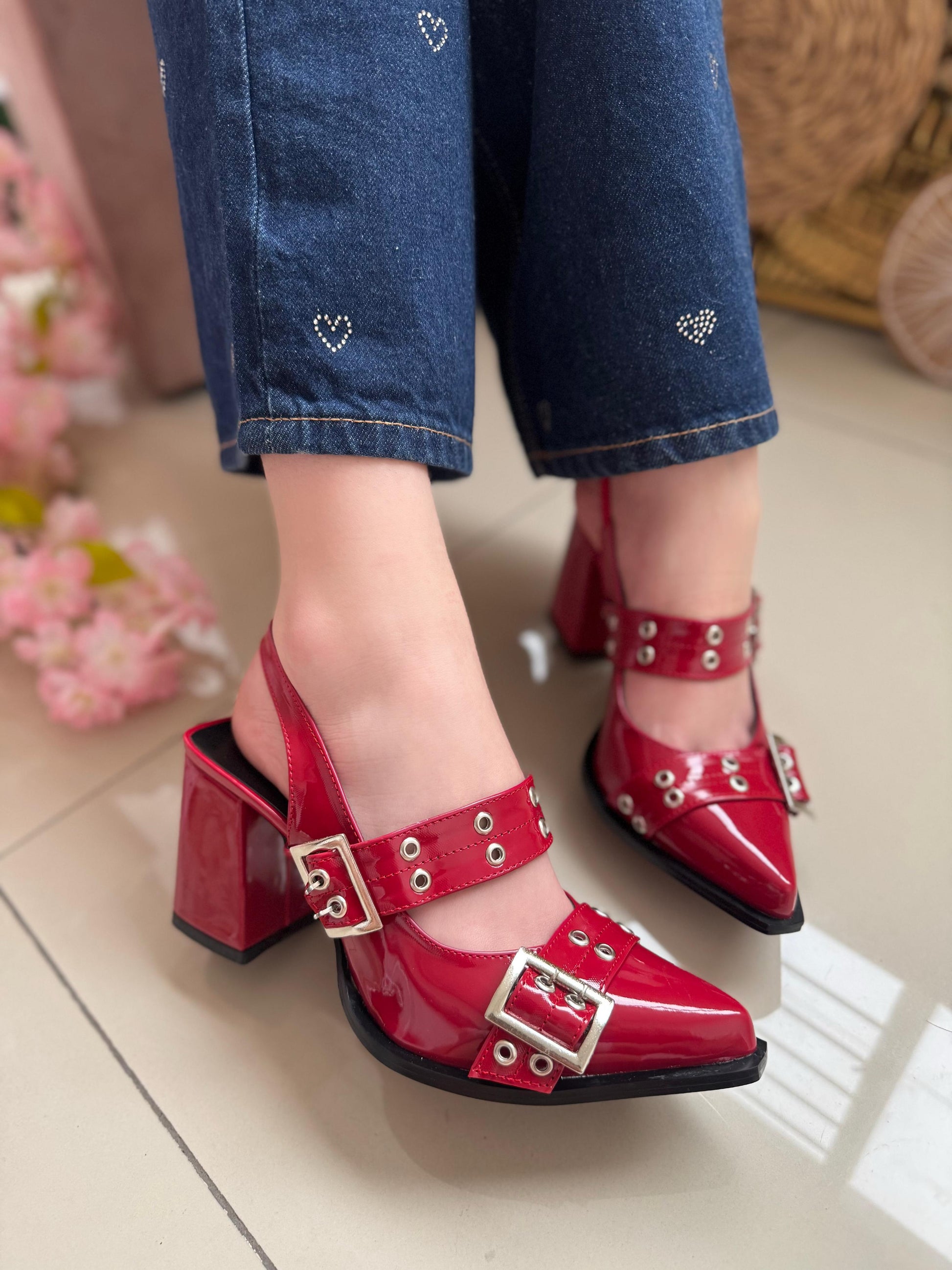 Dale un giro audaz a tu estilo con estos impactantes tacones Mary Jane en charol rojo. Su diseño con hebillas y ojales metálicos les aporta un aire rockero y sofisticado, ideal para quienes aman destacar con cada paso.