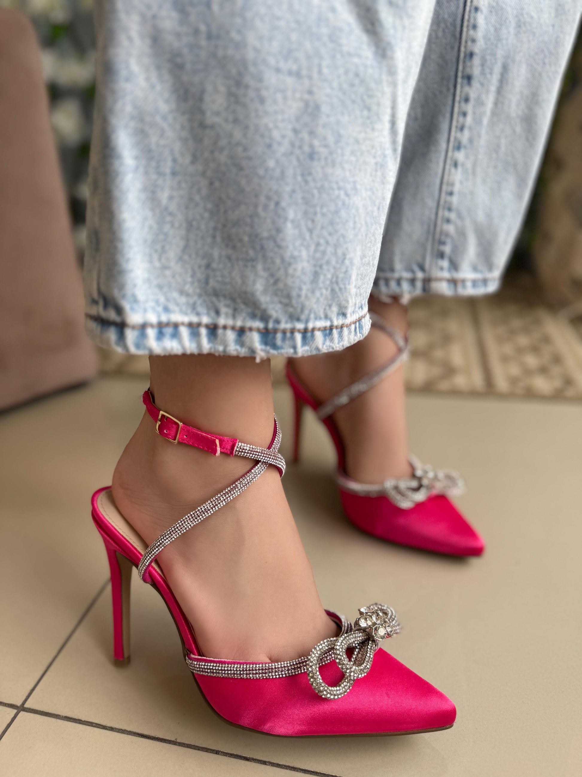 Haz que cada paso brille con elegancia y glamour con estos tacones en satín fucsia, diseñados para mujeres que aman ser el centro de atención. Su tono vibrante y sofisticado se combina a la perfección con los detalles de pedrería y cristales que recorren las tiras y adornan el frente con un moño glamuroso, convirtiéndolos en una joya para tus pies.