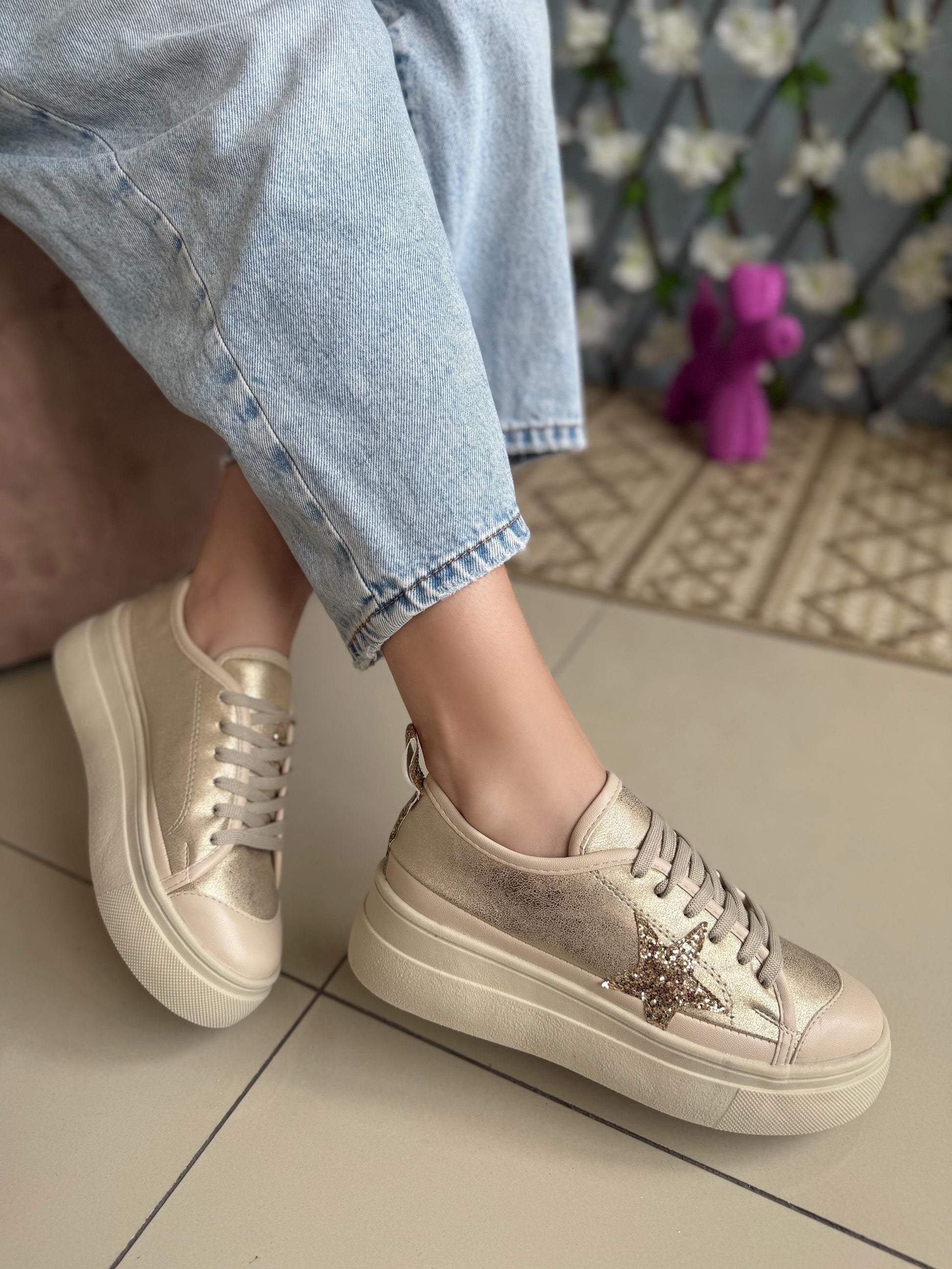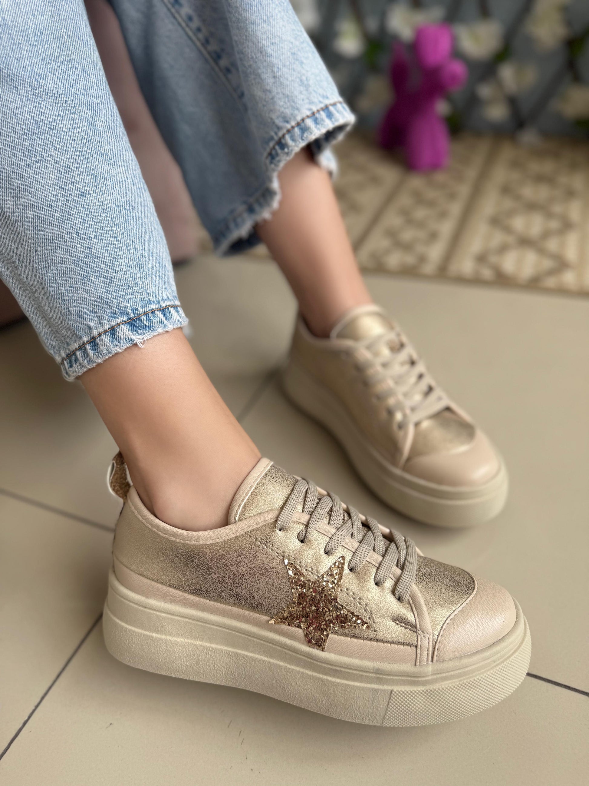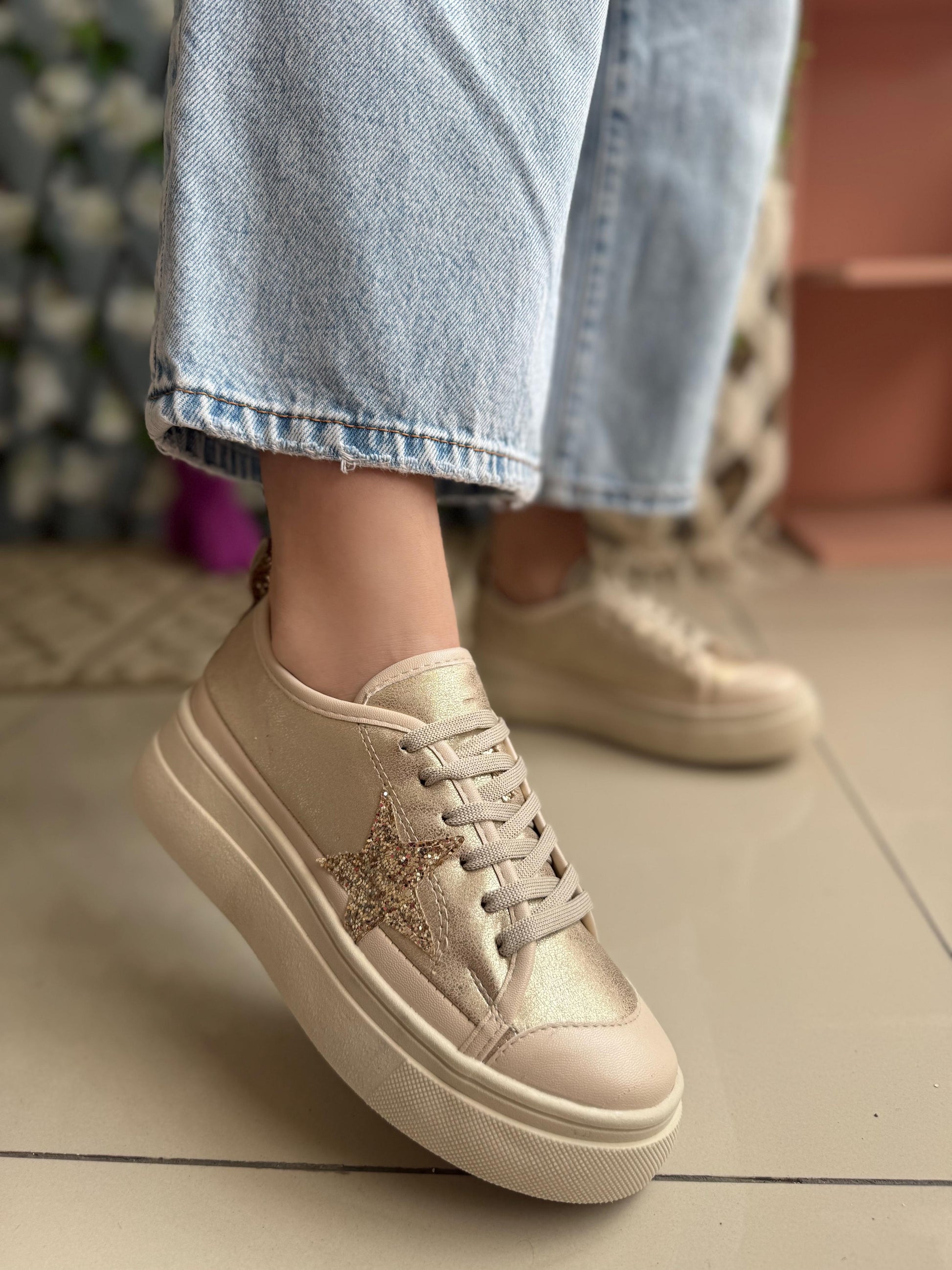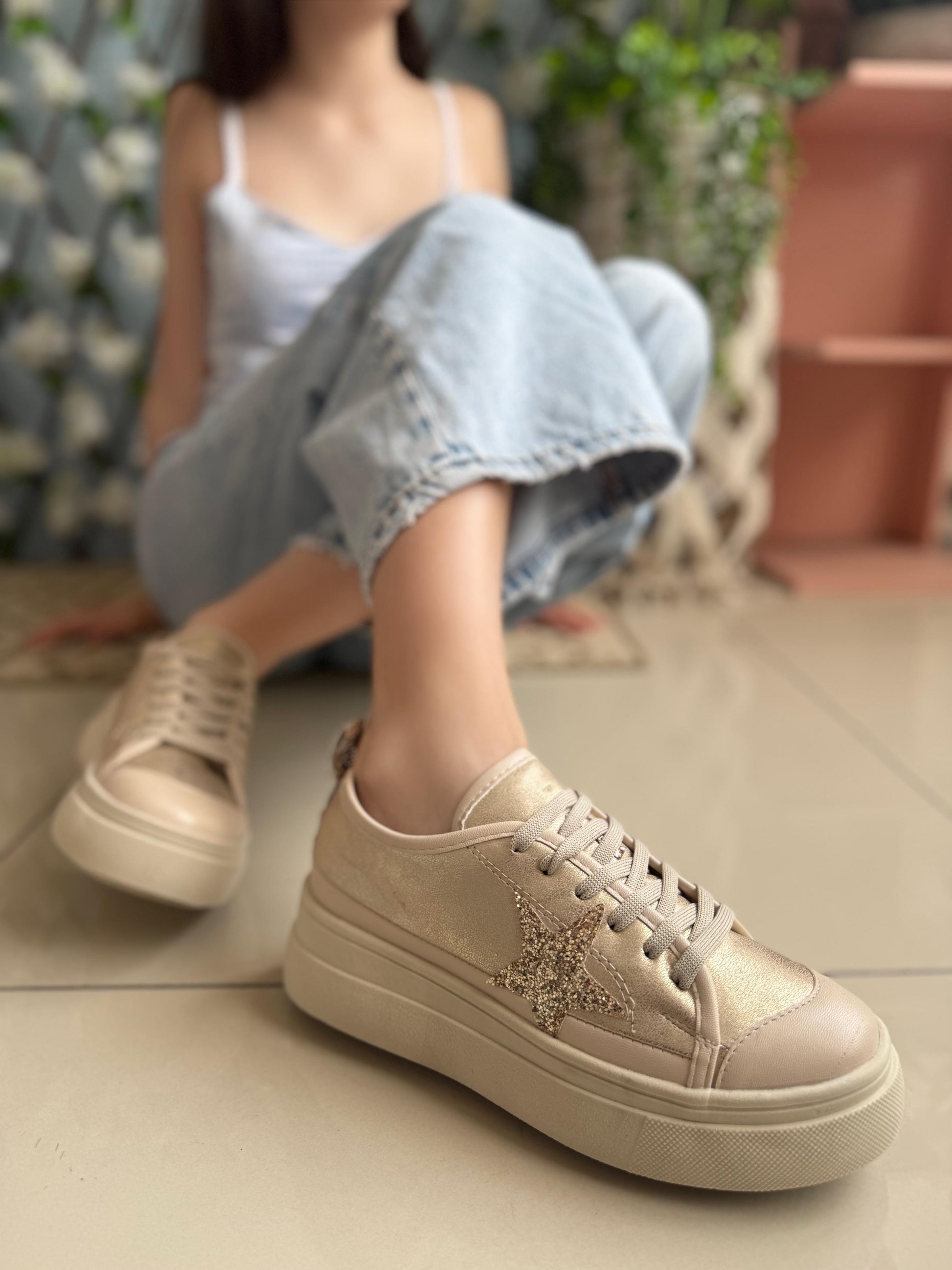 Estos tenis dorados con estrella glitter son el complemento perfecto para darle un toque glam y juvenil a tu estilo. Su diseño metálico con acabado brillante y detalle de estrella en glitter los hace irresistibles para quienes aman destacar sin perder comodidad. ✨