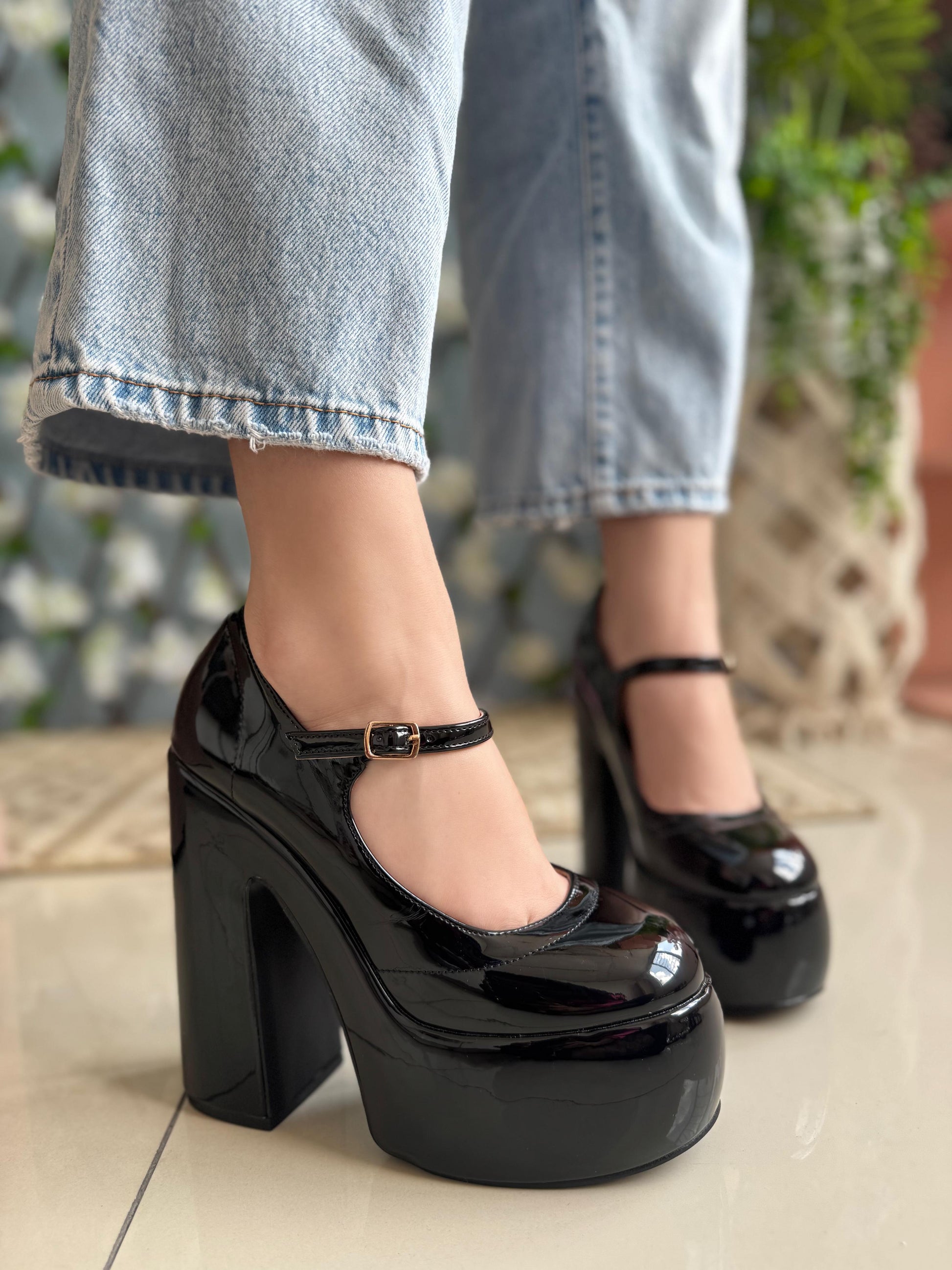 Atrévete a destacar con estos tacones de plataforma en charol negro, el calzado perfecto para elevar tu estilo con un aire atrevido, glamuroso y lleno de personalidad. Su acabado brillante aporta ese toque de sofisticación que transforma cualquier look en un outfit de impacto.