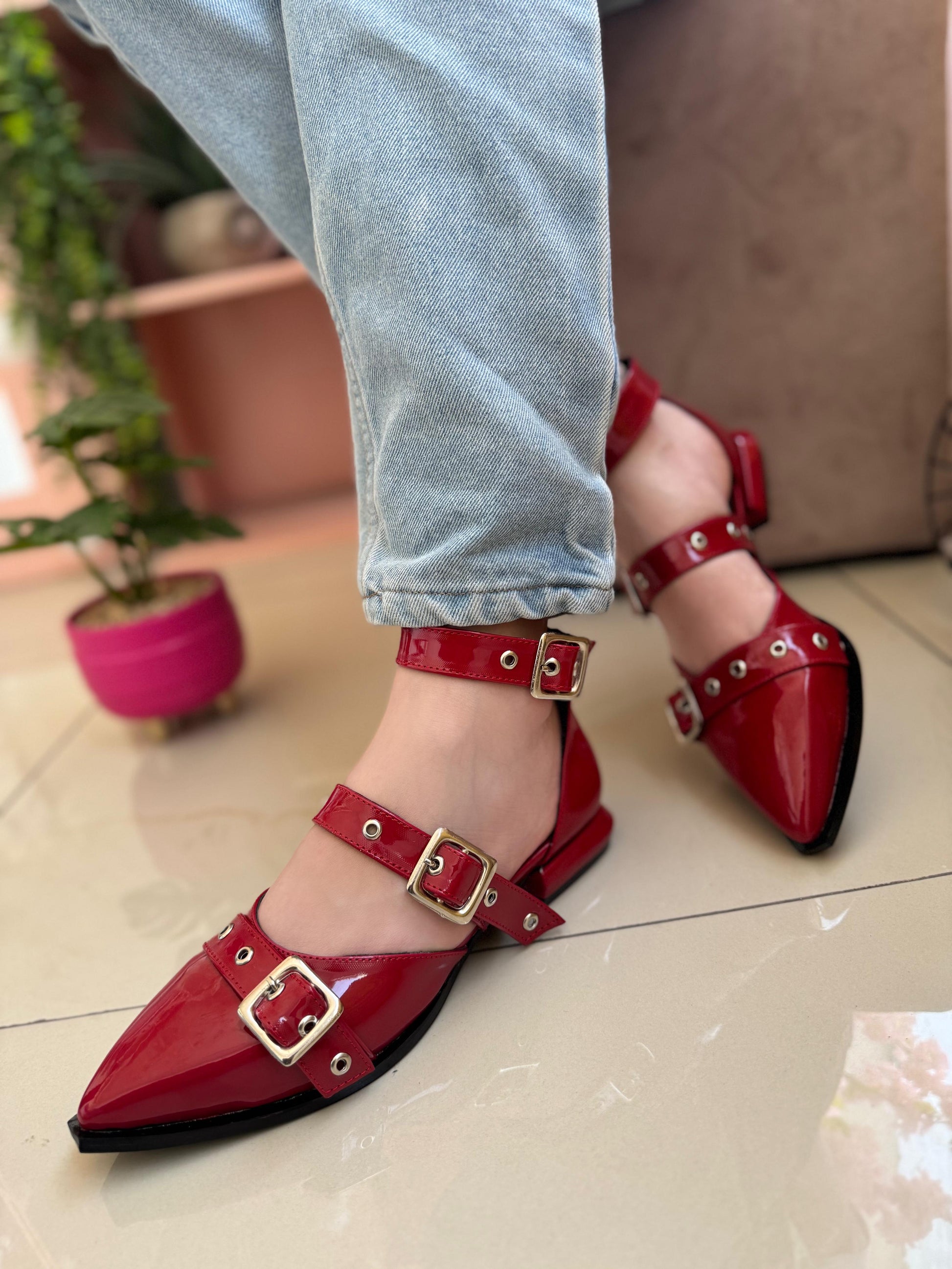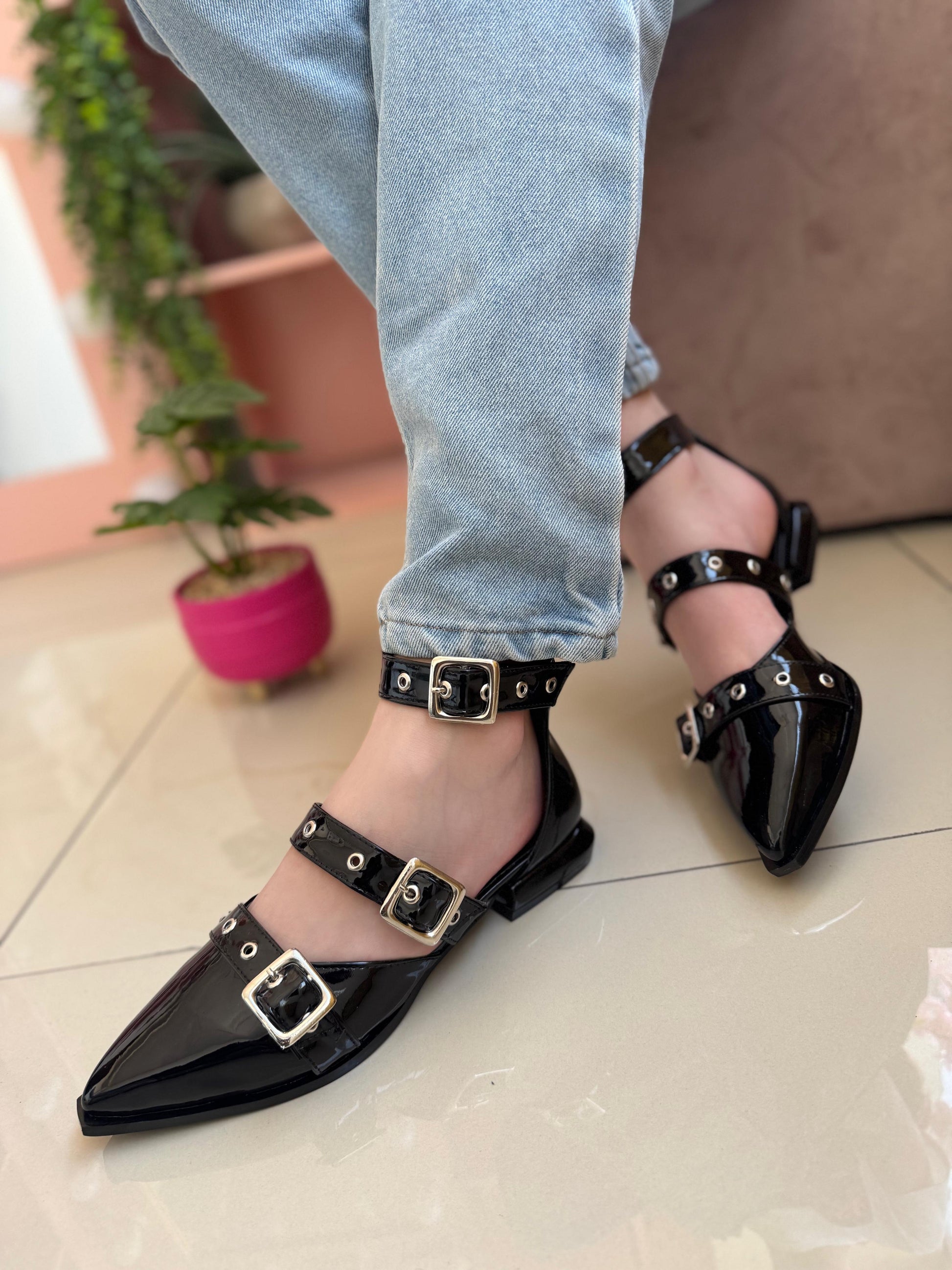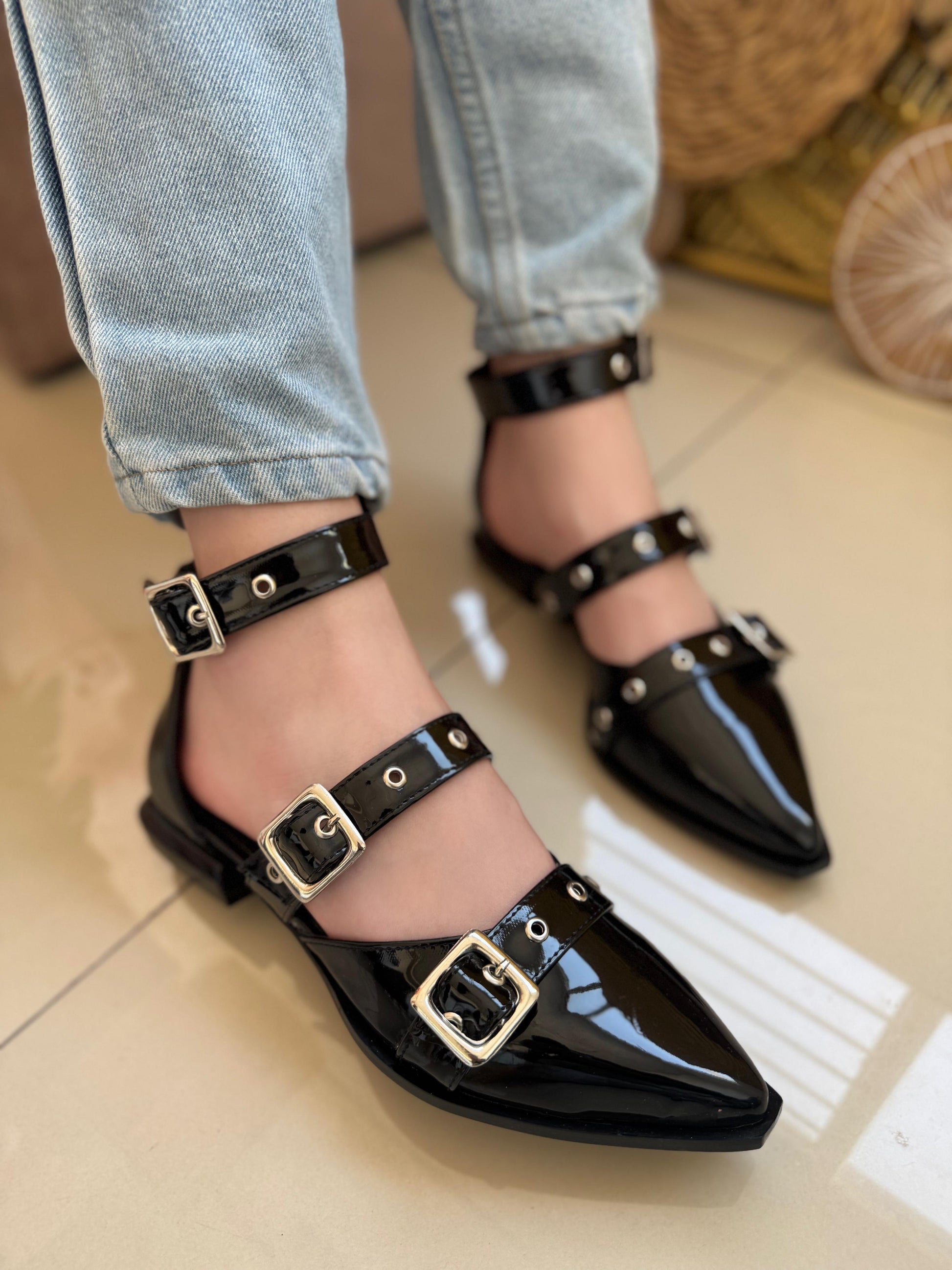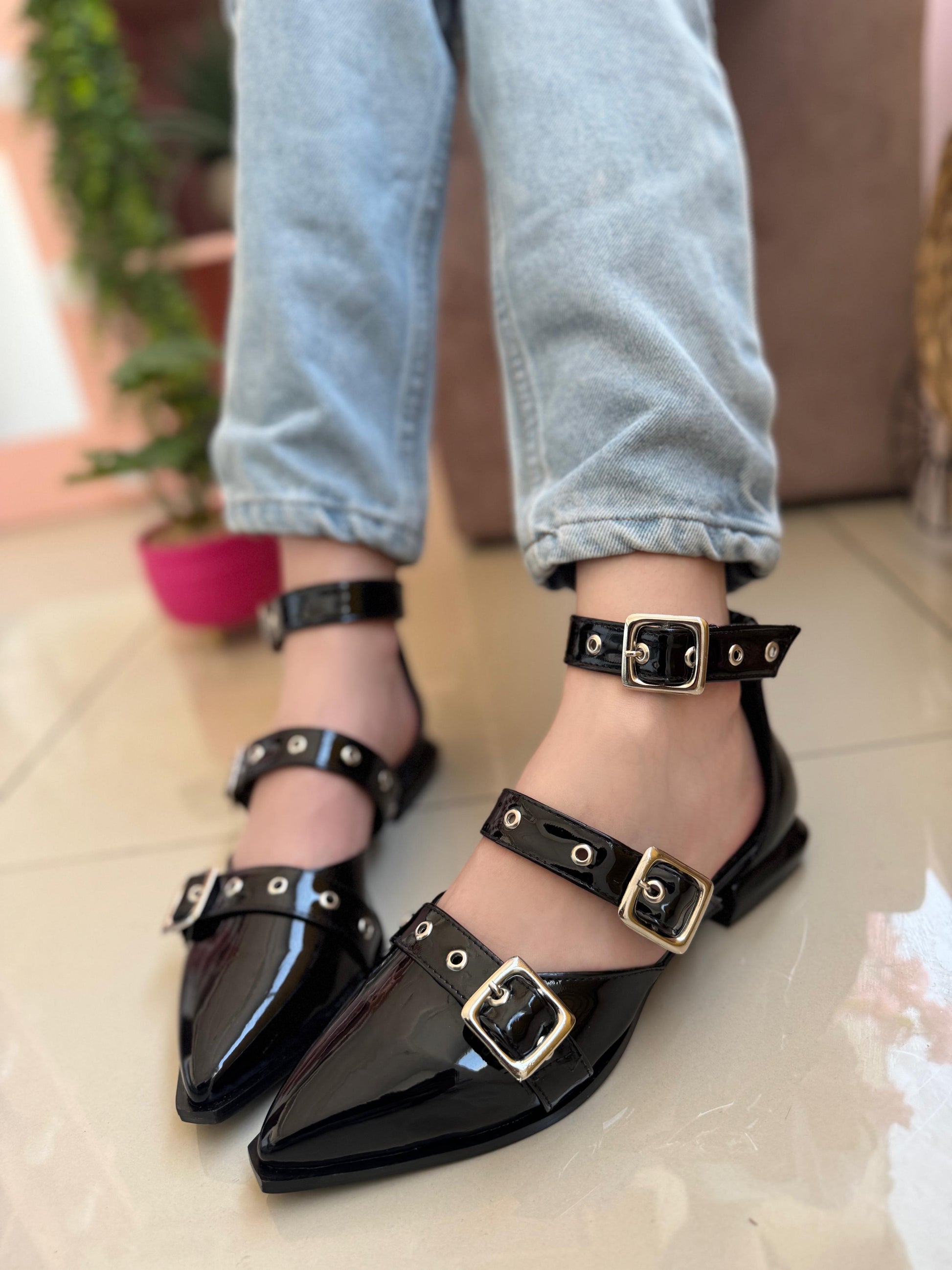 Dale un giro audaz a tu estilo con estos flats de charol con punta fina y hebillas metálicas. Su diseño combina a la perfección la sofisticación clásica con un toque rebelde y moderno, haciéndolos ideales para quienes buscan destacar con personalidad.