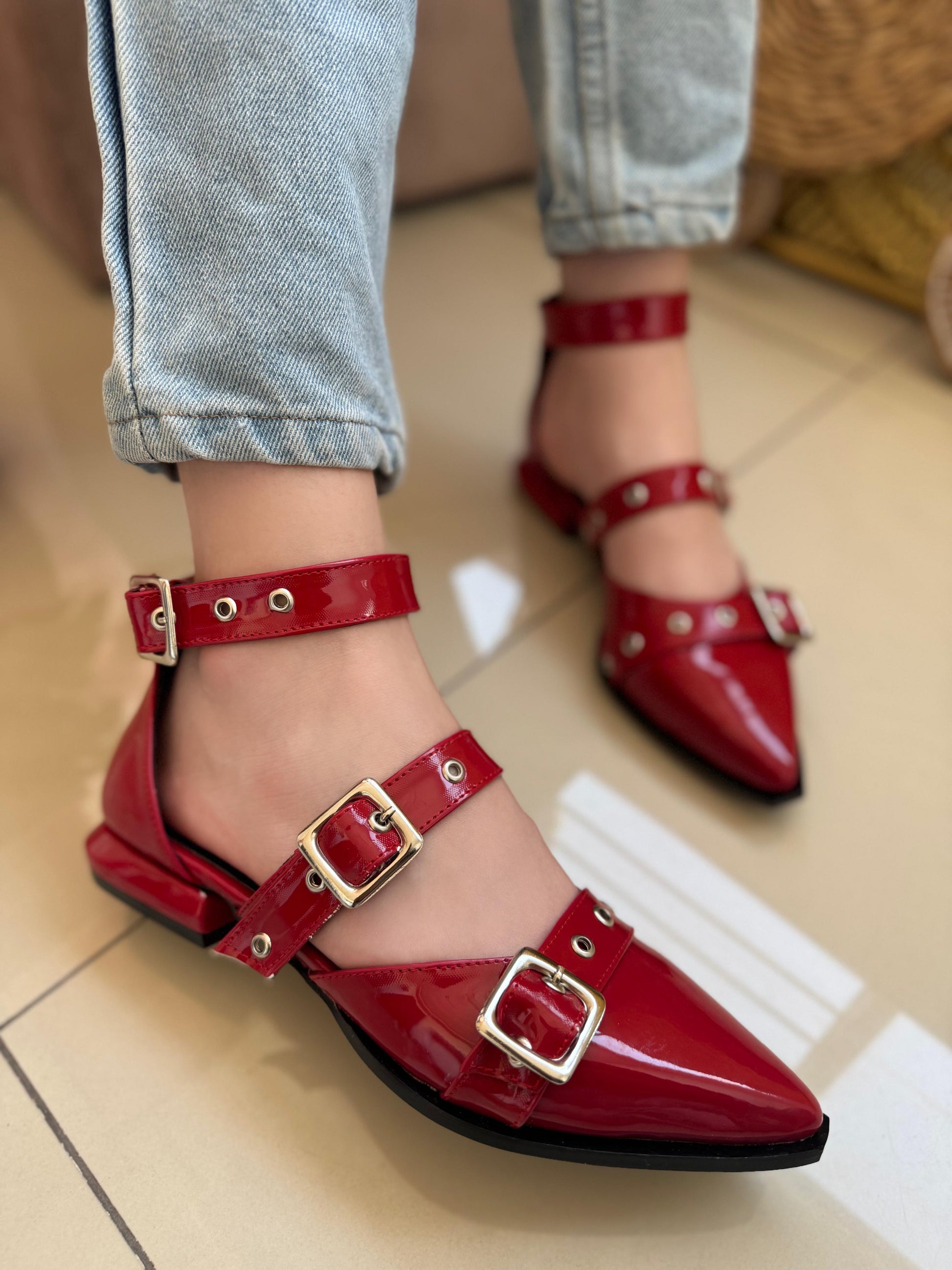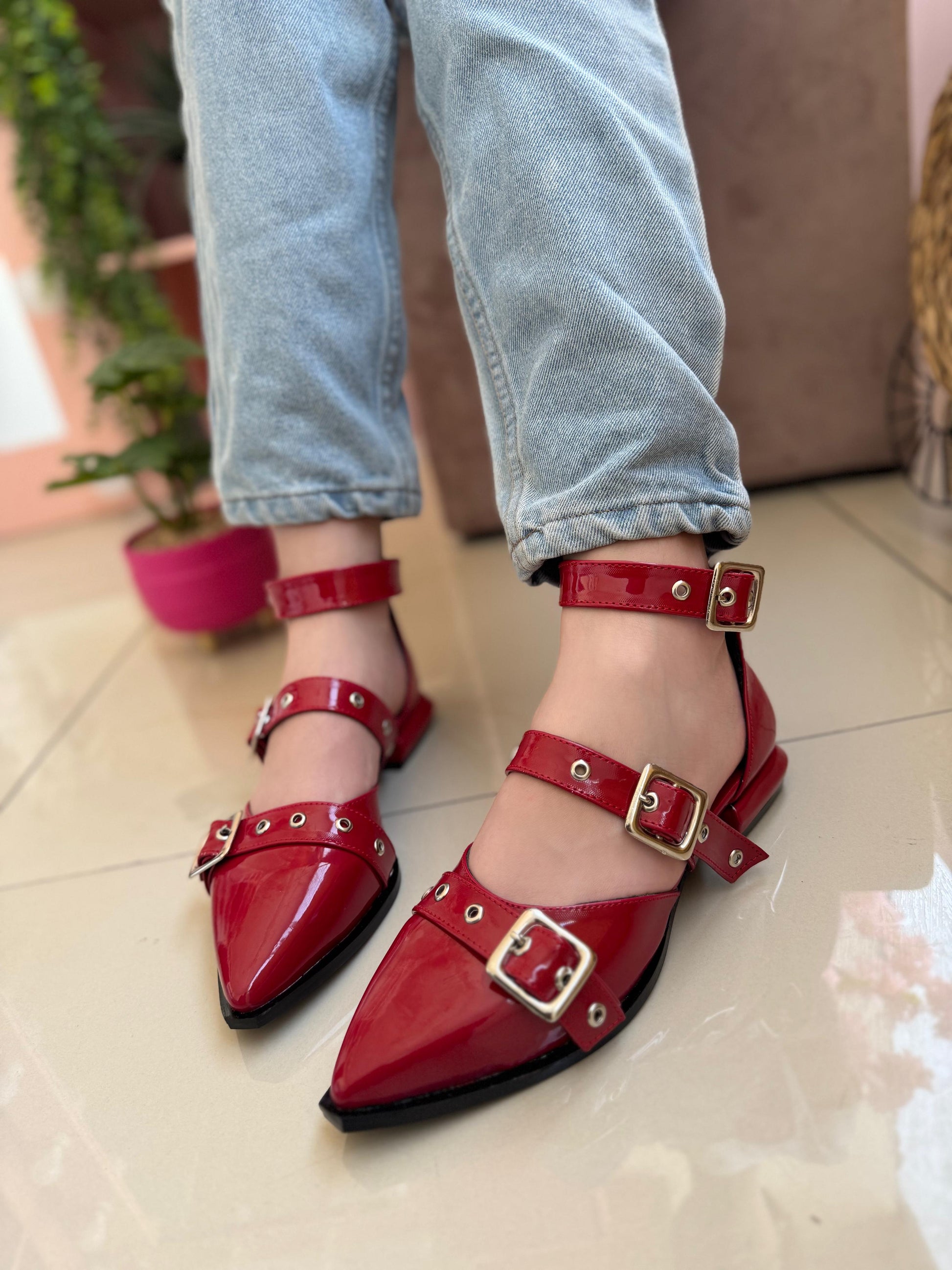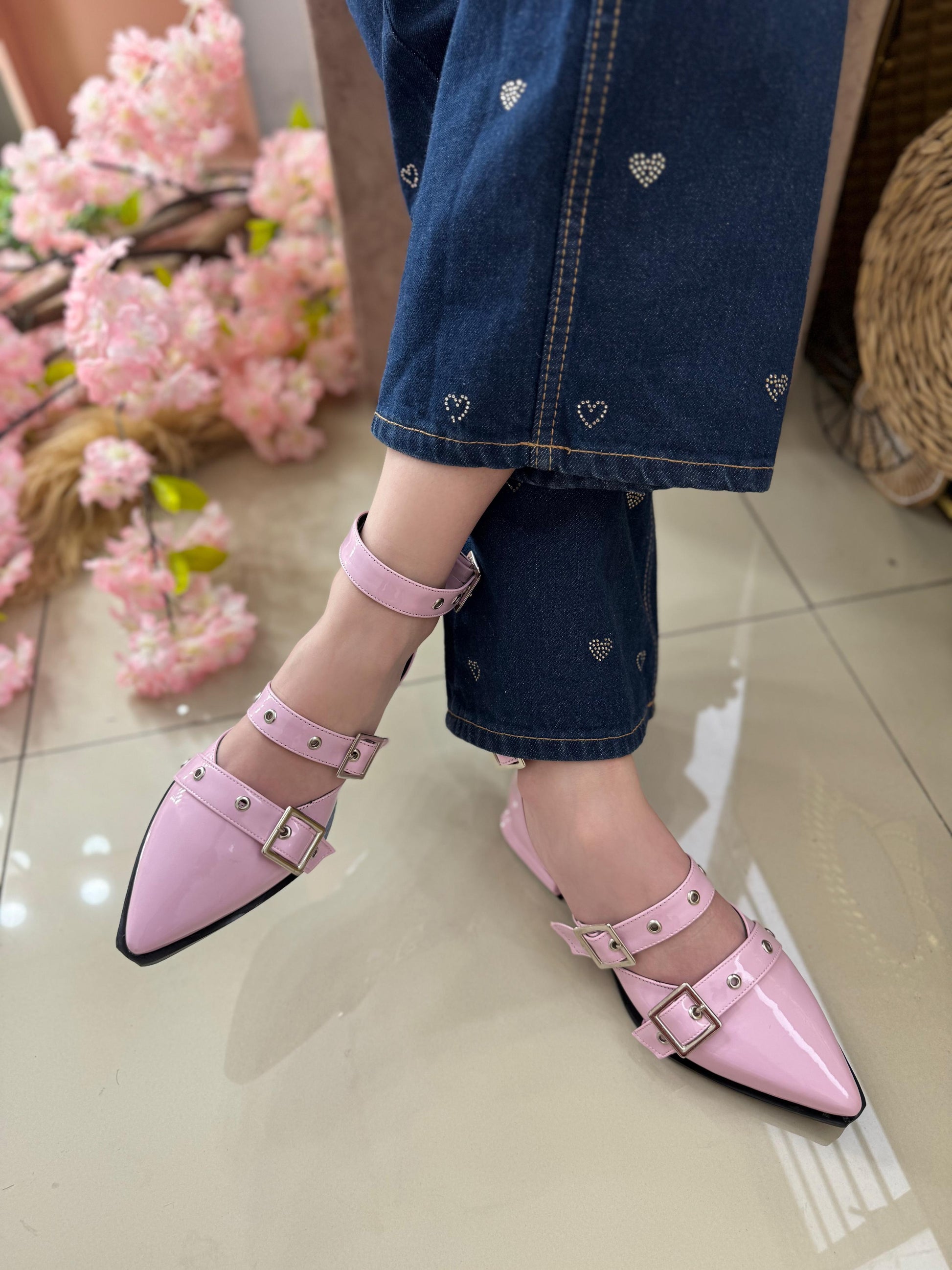 Dale un giro audaz a tu estilo con estos flats de charol con punta fina y hebillas metálicas. Su diseño combina a la perfección la sofisticación clásica con un toque rebelde y moderno, haciéndolos ideales para quienes buscan destacar con personalidad.