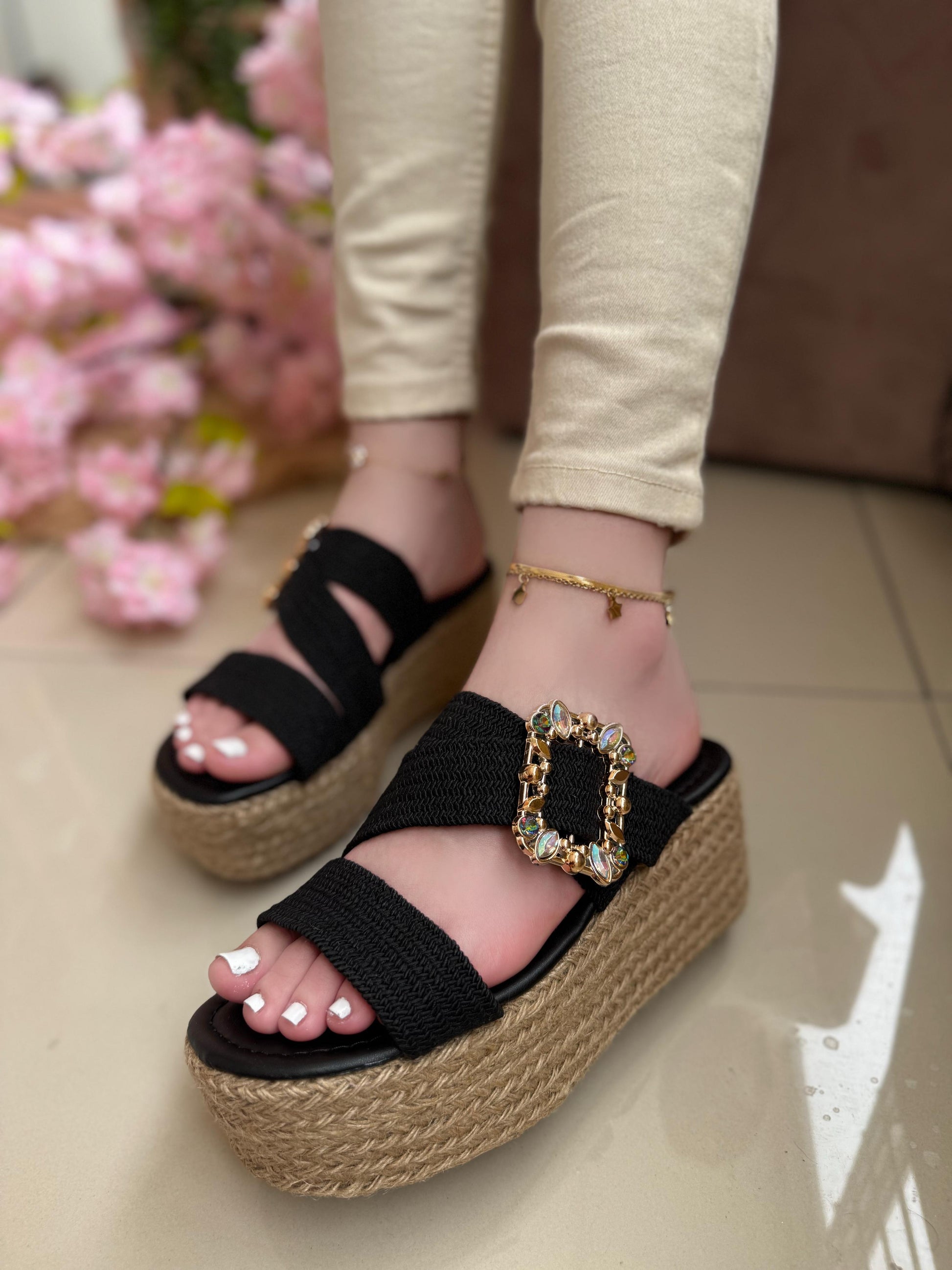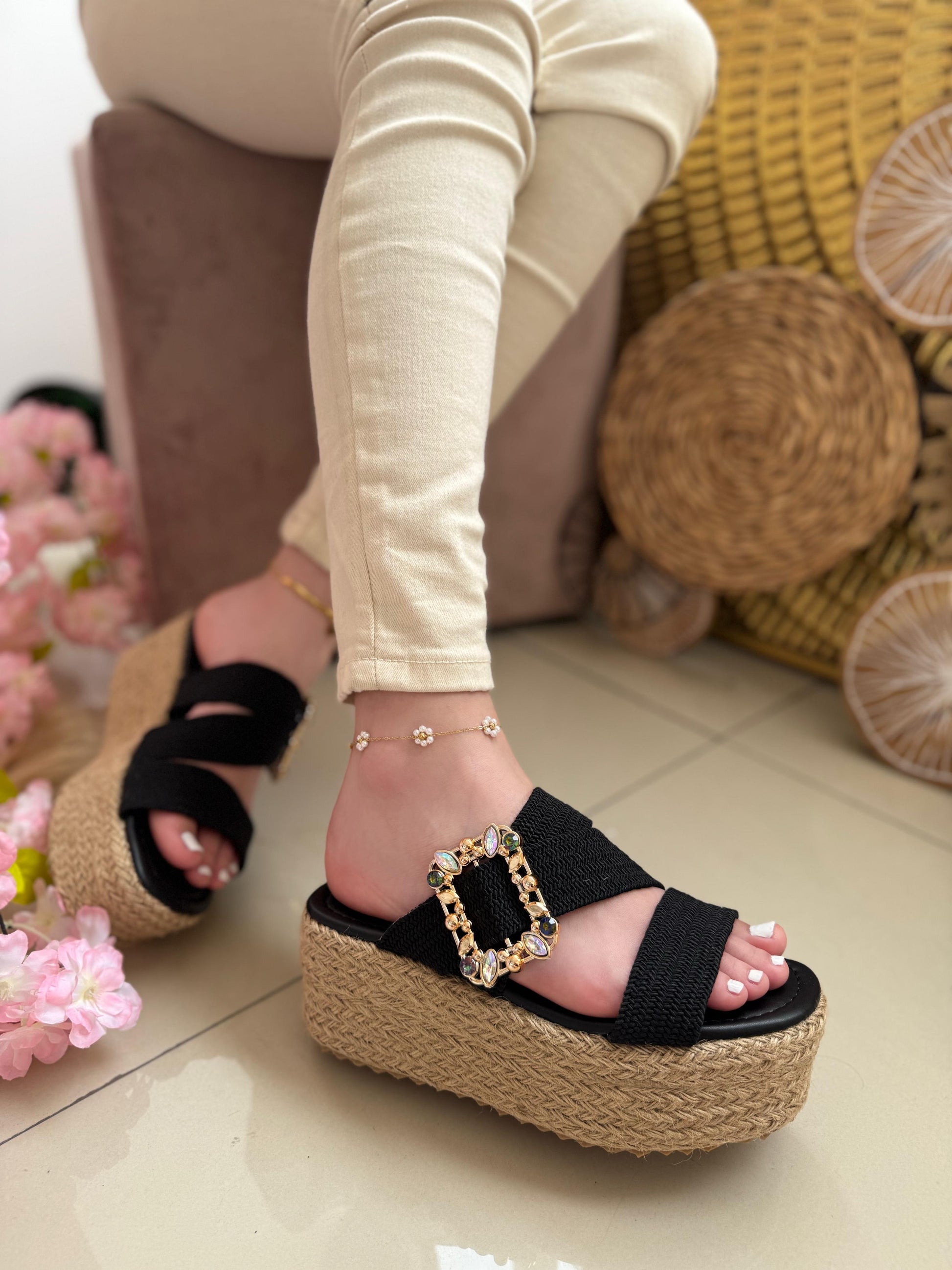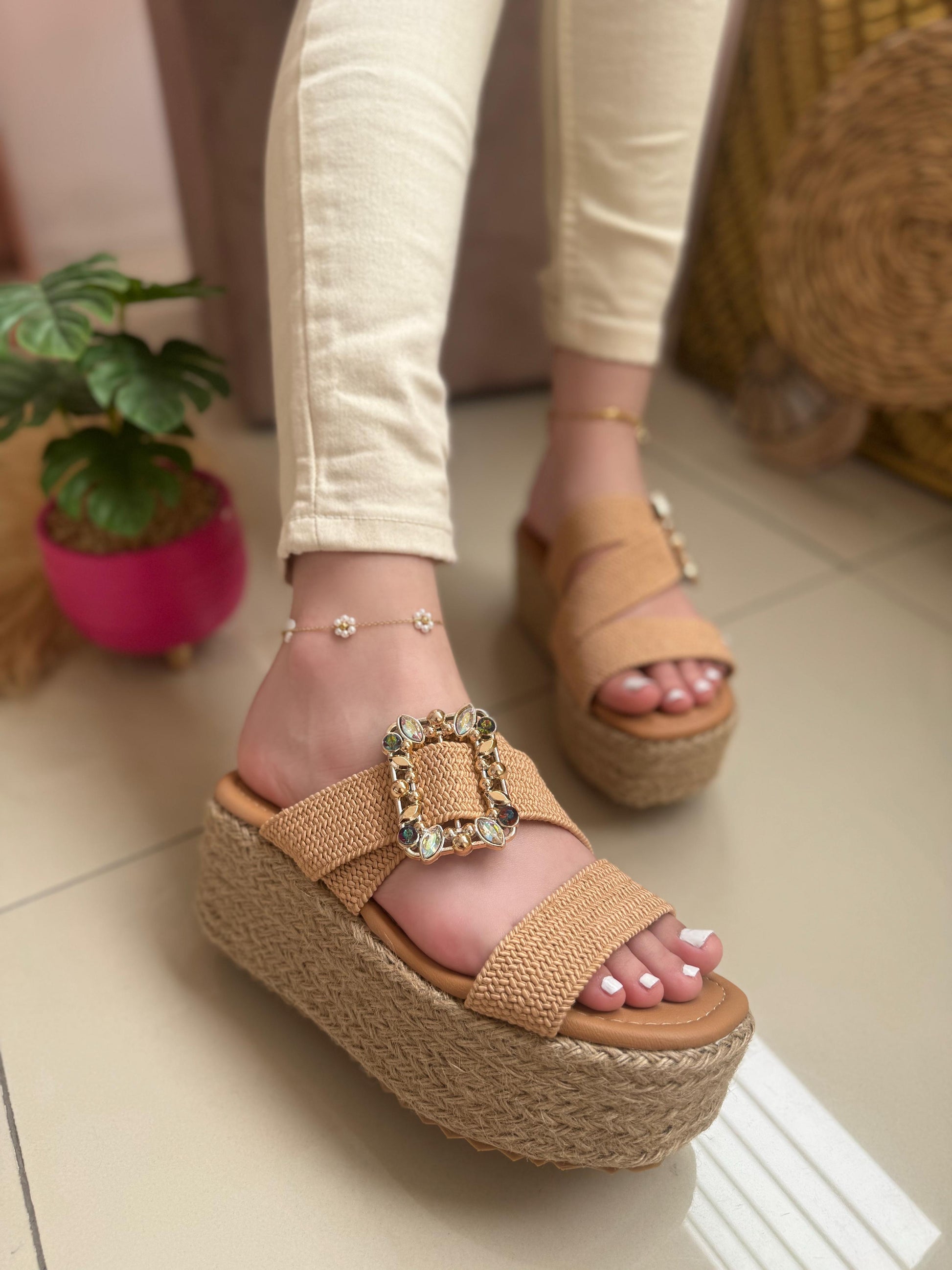 Luce radiante y a la moda con nuestras sandalias de plataforma de yute, el calzado perfecto para realzar tu estilo con comodidad y sofisticación. Diseñadas con una suela de yute trenzado, brindan un toque bohemio y chic, ideal para cualquier ocasión.