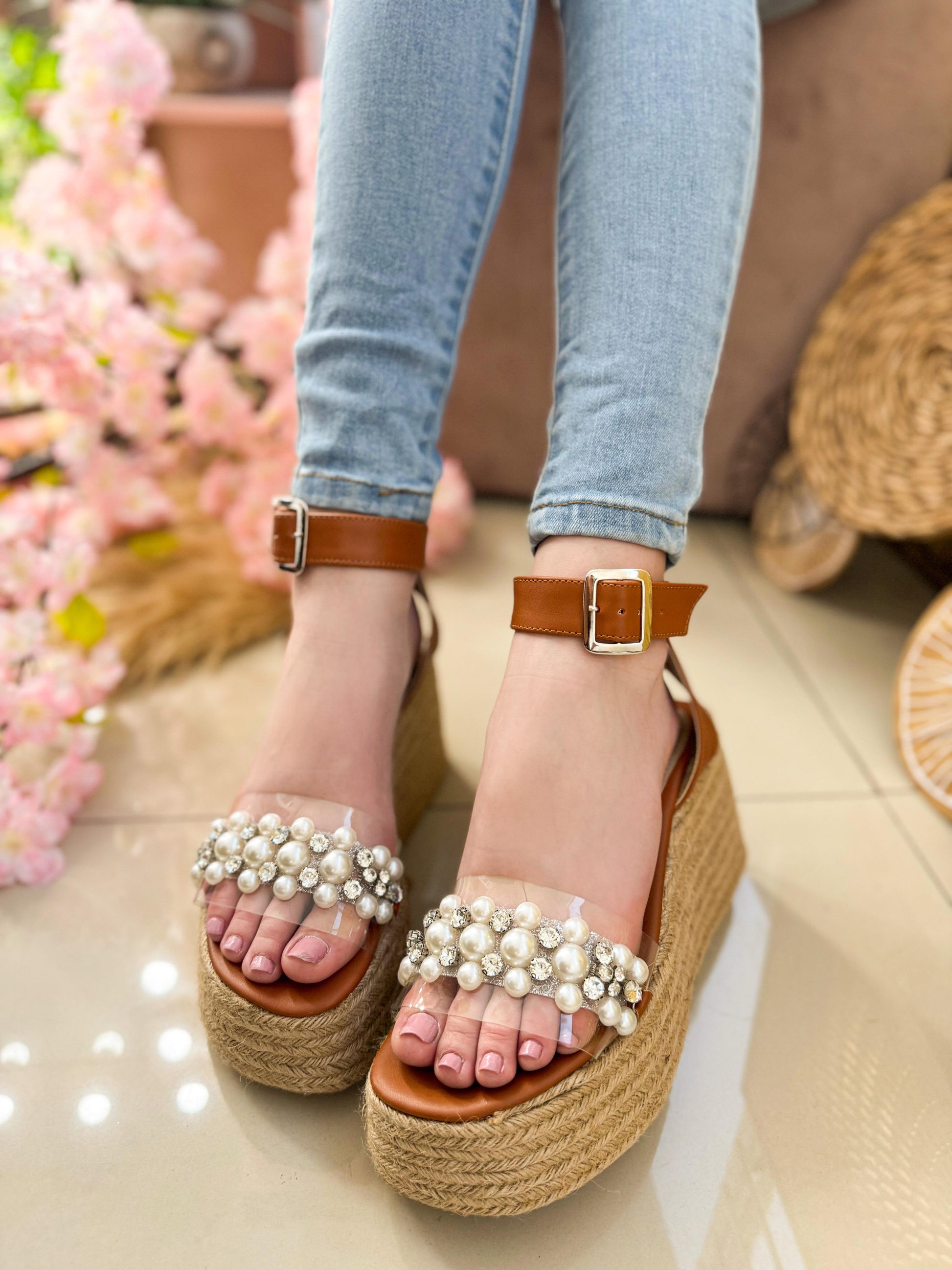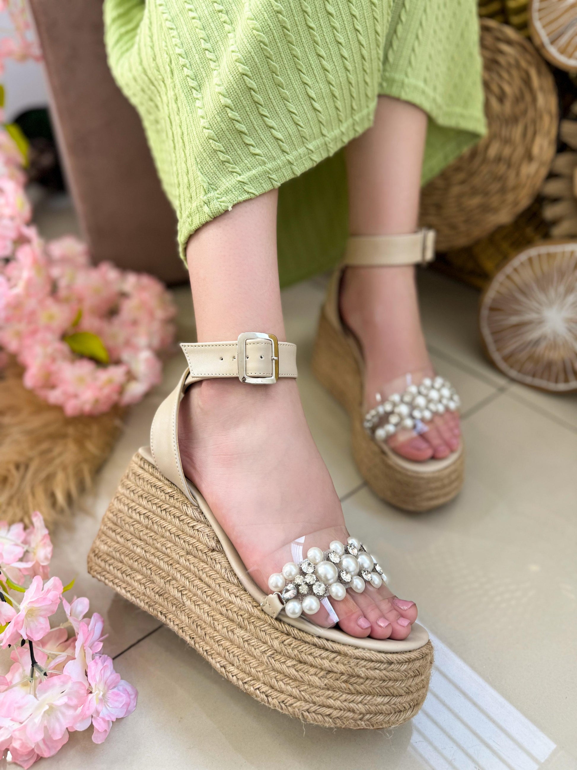 ✔️ Diseño exclusivo: Plataforma de yute trenzado con aplicaciones de perlas y pedrería para un toque glamuroso.