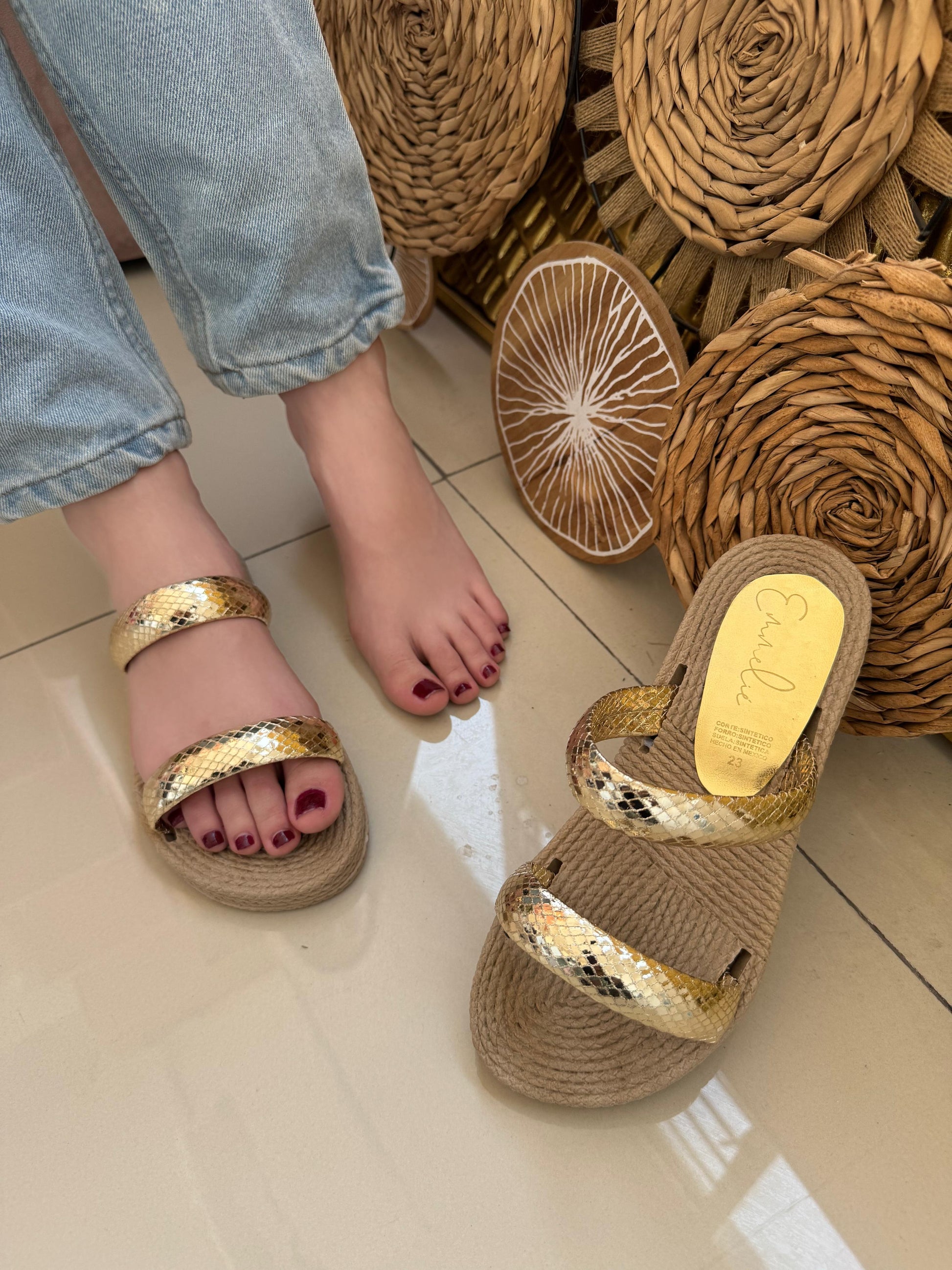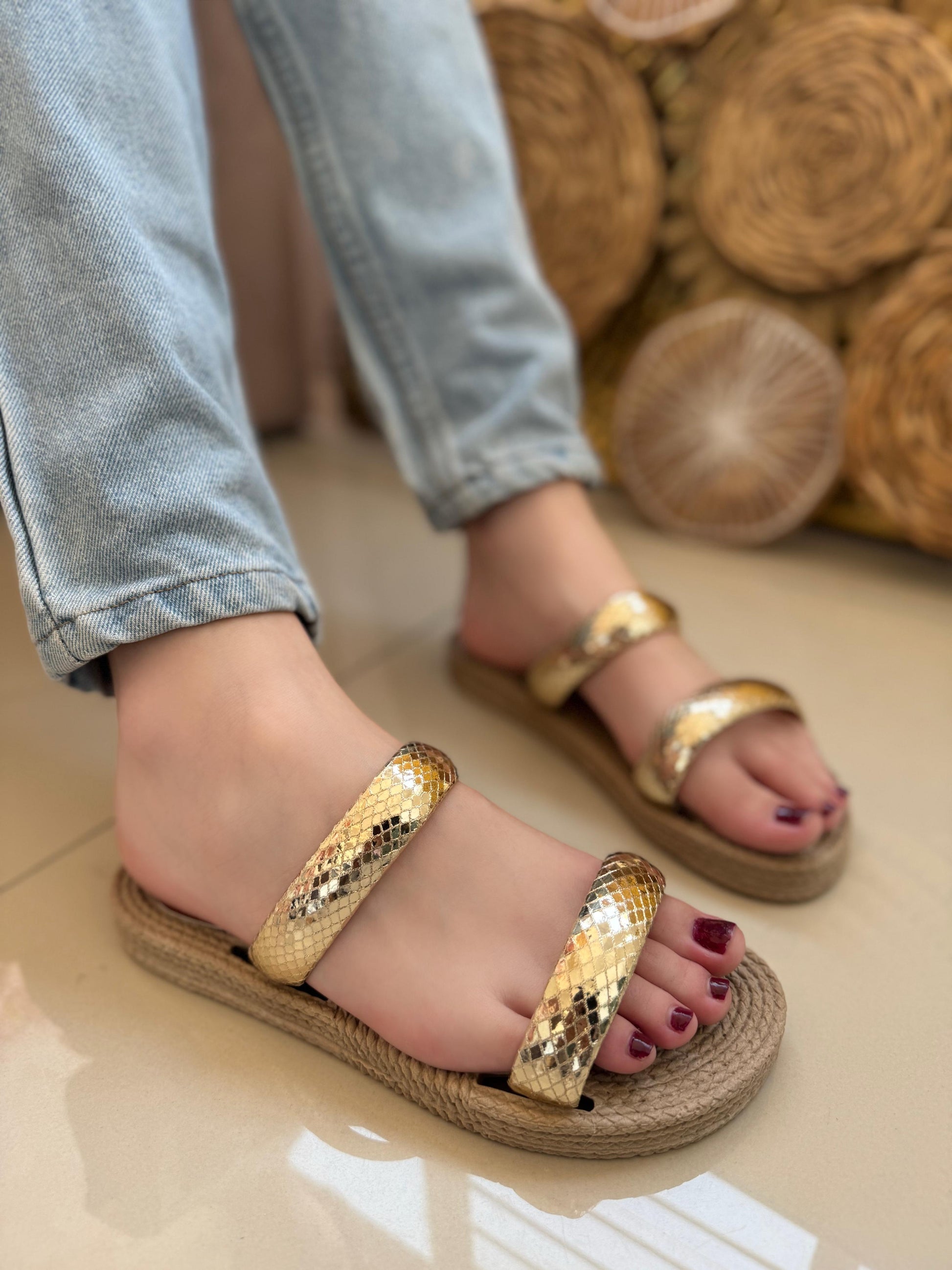 Dale un toque de elegancia y sofisticación a tu look con nuestras sandalias doradas de doble tira. Diseñadas para brillar con su acabado efecto piel de serpiente en tono dorado, estas sandalias son la combinación perfecta entre comodidad y estilo.